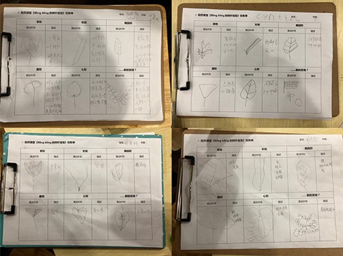 出发前,袁老师像大家提问“树叶掉下来的时候哪面朝下?”通过户外观察,孩子们发现是正面朝下,追着老师问原因,激发了孩子们的探索精神。接着,带上任务单,寻找不同形态的叶子,大家专注的观察每种叶子的特征,绘画并做记录。